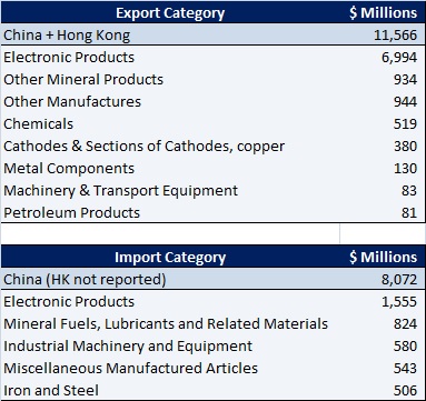 Exports from the Philippines to China consist mainly of electronic products with minerals (mining products) important, too.