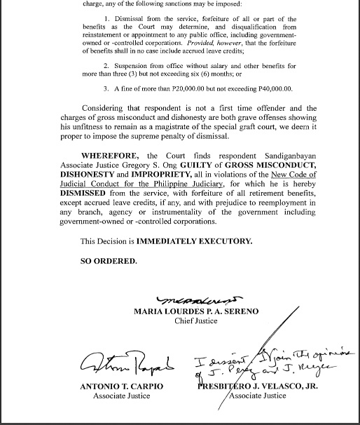 Justice Leonen cited disagreement with the dissents of Reyes, Perez and Barsamin, who held that Ong’s transgressions were minor. Justice Leonen found them flagrant. He wrote:
