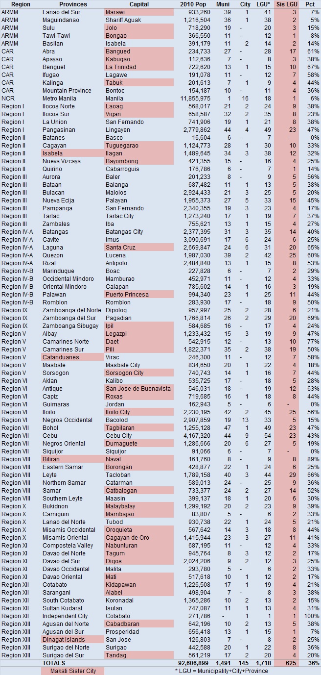 This table shows how extensive the Makati Sister City program is. Follow the red cells. They identify Sister provinces, Sister provincial capitals, and number of Sister LGU’s (“Sis LGU”) tied to Vice President Binay in some form. You can also see why a tie-in with the Arroyo clan in Pampanga is such a good strategic idea for the Binay campaign. It fills a geographic hole in Region III.
