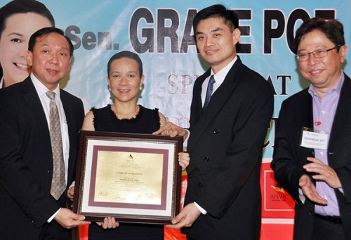 Sen. Poe given award by Anvil Business Club (Assoc. of Young Chinese-Filipino Entreprenuers) [Photo credit: philstar]
