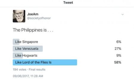 The results of Joe’s poll are not at all surprising. Both Duterte supporters and those who find him or his policies reprehensible, very well represented here, believe endemic chaos and corruption characterize the country. Where the two differ is whether Duterte is the powerful leader that can and will lead the Philippines out of the darkness or plunge it deep into a hellish abyss. Hopefully the ending will be favorable as it was in the Lord of the Flies movie.