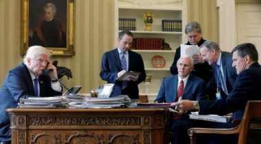 President Donald Trump accompanied by, from second from left, Chief of Staff Reince Priebus, Vice President Mike Pence, White House press secretary Sean Spicer and National Security Adviser Michael Flynn speaks on the phone with Russian President Vladimir Putin. (AP Photo/Andrew Harnik)