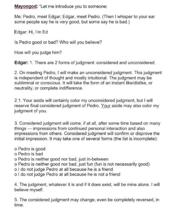 Initially, of course, the scales will contain my unconsidered judgment — my “first impression” as it were — on first meeting Pedro. At certain points of my interactions with him and others, I will update the scales progressively. As time goes on, the scales may tip one way or the other. At this point, I will have formed a working opinion, a more-or-less concrete judgment, of Pedro’s character.