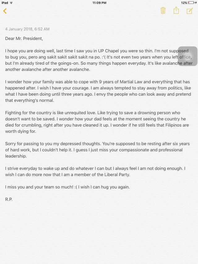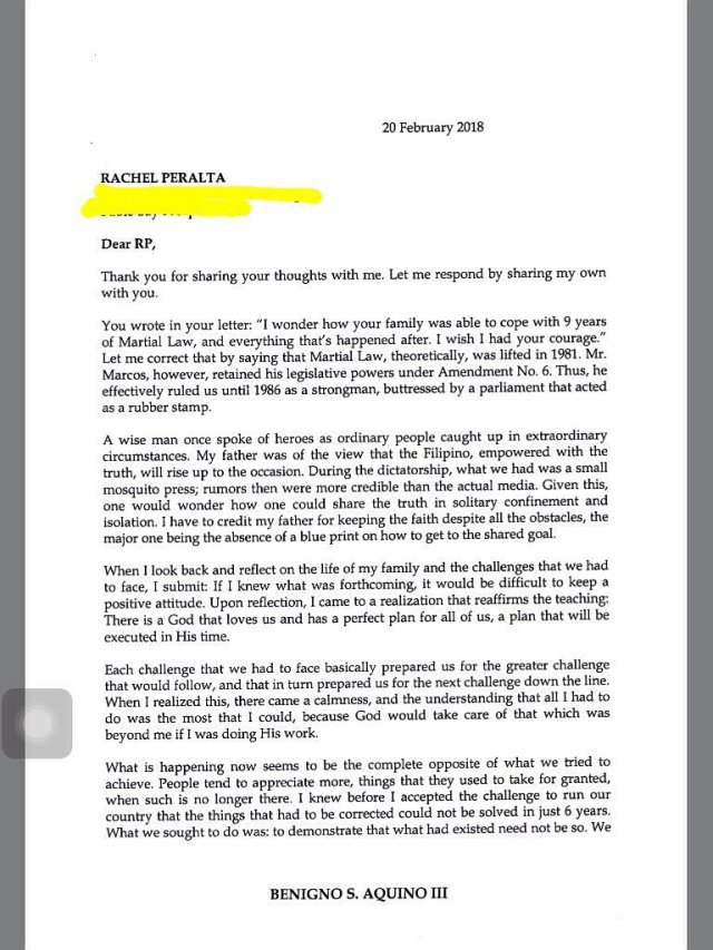 I thank Rachel Peralta for sharing her correspondence with former President of the Philippines, Benigno S. Aquino III, and thank President Aquino for his graciousness in allowing her to handle the correspondence as she wishes. Many of us wonder what the President thinks about things, and here we have new insights. I imagine that critics will criticize. And others will find inspiration. In that regard, we are allowed to define ourselves. JA