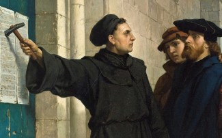 Martin Luther posts his 95 theses on the church door. [Photo source: id916.com]