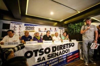 Senator Pangilinan speaks to the press at the introduction of the Otso Diretso senatorial slate campaign.