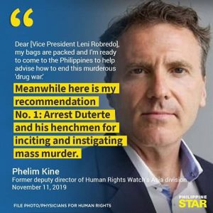 The former director of Asia’s Human Rights Watch organization, a man named Phelim Kine, did not apply discretion. This is what he wrote on Twitter as soon as VP Robredo accepted the drug leadership role: