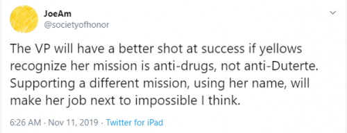 I read your comment on FB, Will. I don’t agree that they cannot be separated. The Vice President’s success rides on HER making the correct judgments on what her priorities should be, and so far, I think she is 100% on the right path. Her immediate priority is to stop the killings and do the important RIGHT things: education of youth, rehabilitation and counseling, and I suspect going after pipelines into the Philippines (I’ve not read anything on that). She’s not there to punish or get China out of the seas or anything but build a respectful, working drug program. Kine’s rant was poorly done and the VP should thank Sec Locsin for keeping him out of her hair.