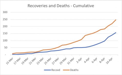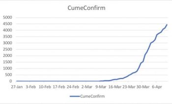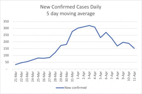 I checked that on April 2, its Case Doubling Time was 13; about a week after that, 9; and today about 5. Fortunately for the country, the death from the virus stands only at 11 — a death to cases rate of only 0.2% compared to more than 4% for most countries.