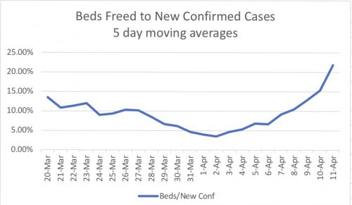 Chart 3 below introduces a new concept of “Beds Freed Daily”. This is the sum of recoveries and deaths among confirmed patients. A five-day moving average is used to smooth out the day-to-day fluctuations. We can see that, as the base of confirmed patients increases, so do recoveries and deaths. These beds can be given to new patients coming in. The whole purpose of flattening the curve is to recognize that hospital facilities are limited. Re-use them.