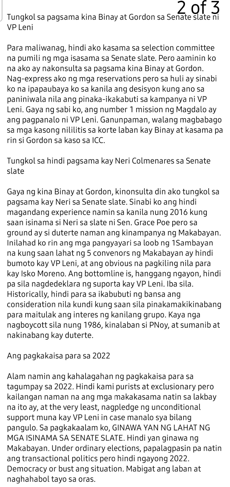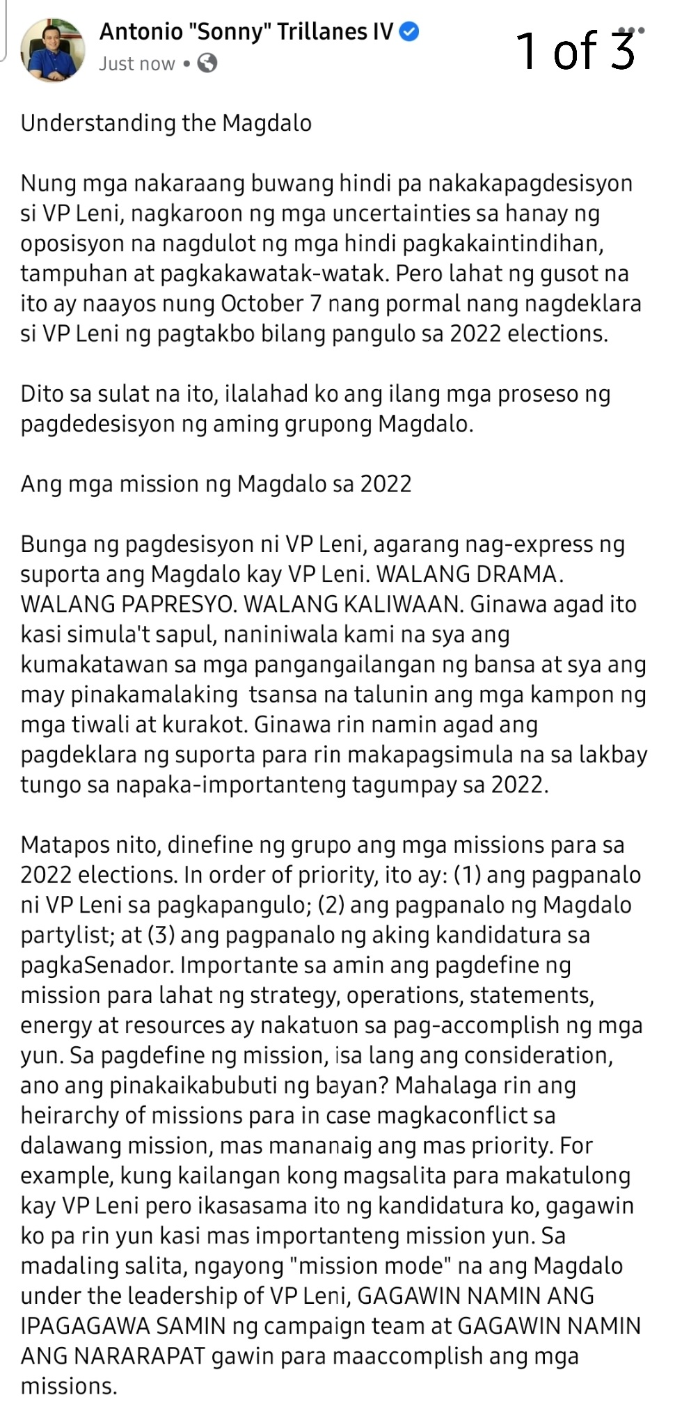 I respect the decision of my party to choose Mayor Isko Moreno as candidate for president, but also believe VP Leni is a much better candidate in this most crucial of elections.