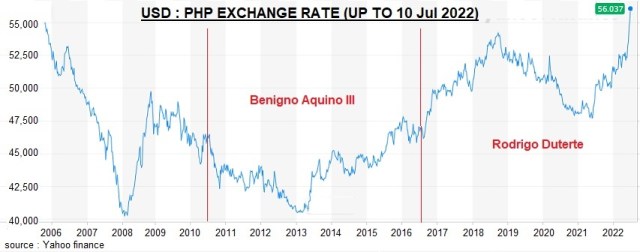 Trade deficit means a net outflow of funds. As more Pesos are sold for foreign currencies to pay for more imports, the consequence is downward pressure on the exchange rate. Pnoy Aquino started with the rate at about USD1: PHP46.0. The rate appreciated by about 10% and slipped back to 46.0. Duterte’s admin saw the pesos depreciate by about 21.8% to 1:51.0