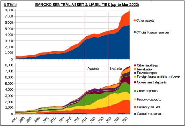 Under Duterte, his appointee CEO of Bangko Sentral, Benjamin Diokno, further increased reserves by about USD1.3 billion, bringing the total to about USD5.5 billion.  Diokno’s reserve purchases were funded by massive currency note printing and government deposits. Where are the huge government deposits coming from – increased domestic debt as shown in the national debt chart. Currency assets carry a valuation risks. Diokno’s reserves now carry a huge unrealised revaluation loss due to appreciation of peso. As at Mar 2022, this unrealised loss stands at USD588 million.