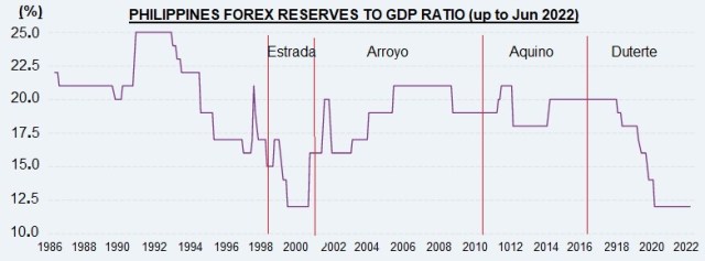 Estrada raided the reserves which plunged to its lowest level ever about 12% of GDP. Arroyo did well to bring it up to 20% level, whilst Aquino was quite consistent at the 20% level. Here comes Duterte and the reserves dropped to equal Estrada’s lowest at 12%. For comparison, Switzerland has the highest ratio in the world at 115%. Singapore was at 105% before it moved some reserves to its sovereign wealth fund recently which brought the figure down to 91%.