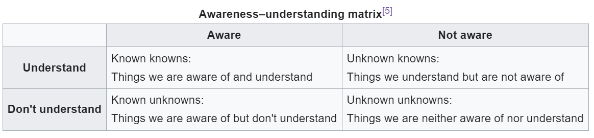 (Table screenshot from wikipedia. The Rumsfeld Matrix (Chapter 13) – The Climate Demon, Saravanan R., Cambridge University Press (2021) Online ISBN 9781009039604, DOI https://doi.org/10.1017/9781009039604)