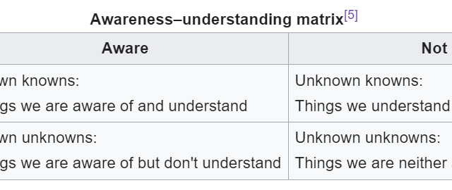 (Table screenshot from wikipedia. The Rumsfeld Matrix (Chapter 13) – The Climate Demon, Saravanan R., Cambridge University Press (2021) Online ISBN 9781009039604, DOI https://doi.org/10.1017/9781009039604)