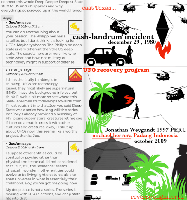 In conclusion, we have three different themes here. There’s us trying to divine what Imee-Leni-Sara (hopefully , Risa will join them soon) intend to do for the Philippines. Which I’ve linked to the Jinn , or simply plasma consciousness, that connects to a not so new reality really. One we’ve always been aware of, which we just now in the modern times chose to forget. Thirdly, I’ve tried to connect those two subjects to the current UFO discourse. That’s, as of 2024, USA’s new Disclosure laws. All three connect , the Philippines, this new reality and the process of disclosing said reality. Imee-Leni-Sara-(Risa) need a new grand narrative. One that’s still being cobbled together here in the USA, but something they can get ahead of and be at the forefront already. Simply change the word psychic to mystic, and Filipinos already are familiar with them. Psychics deal with other people’s minds, whereas mystics deal with God’s mind. Filipinos can be the world’s source of mystics, able to tap into the plasma consciousness that allows faster than light travel into the various dimensions. I am confident D & E Filipinos will be more than open to this, as well as C Filipinos. A & B will probably call this another Pulahanes millenarian movement. They maybe be right, but the USA is moving toward this direction. Within 3 years this is going to be our world. If Imee-Leni-Sara-(Risa) start rolling this new narrative out for the 2025 elections, by 2028 more Filipinos will be open to it. For example, Gilbert Teodoro (National Defense) and Christina Garcia Frasco (Tourism) can totally use UFOs to invite tourists to South China Sea. But for now focus on santelmos.