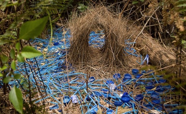 Cover photograph of a bowerbird’s nest from nextnature.org article “Bowerbirds’ Plastic Love Nest“.