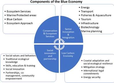 • Ecosystem Services: The blue economy incorporates the value of critical ecosystem services not captured by the market, such as carbon sequestration, coastal protection, and waste disposal, which are essential for the country’s resilience to climate change.