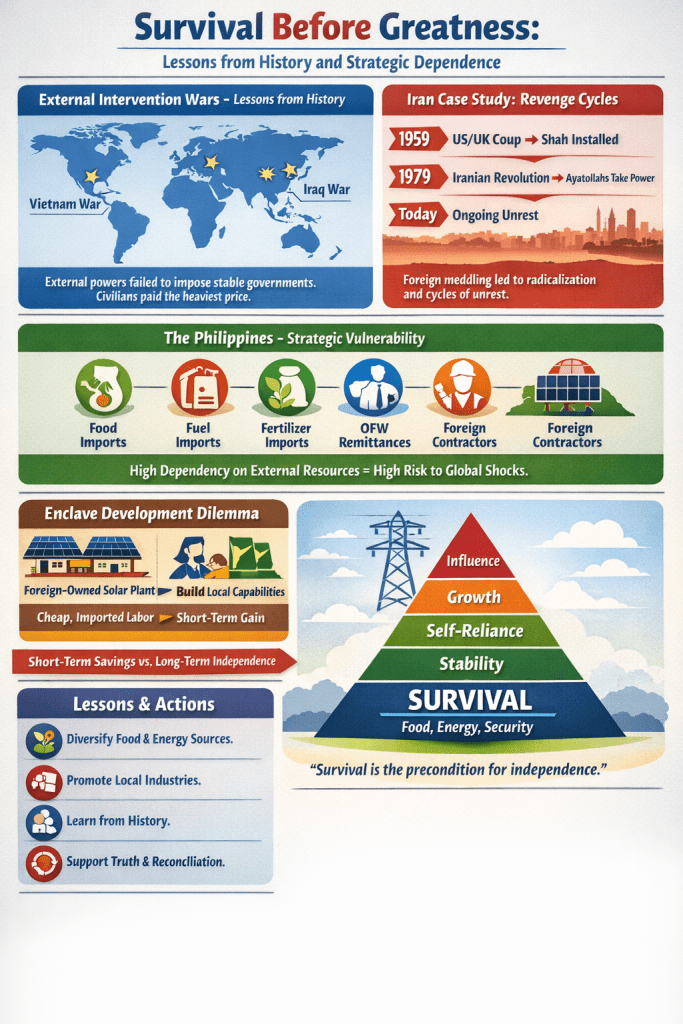 - Philippine vulnerability: Reliance on imported food, fuel, and technology exposes the country to external shocks. Cheap diesel, rice, or electricity may stabilize politics short-term but create fragility in crises.