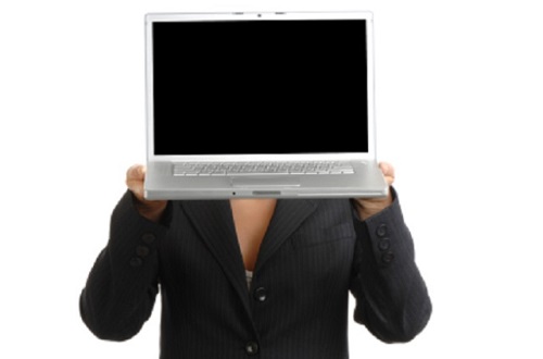 Businesswoman on white holding blank laptop in front of face